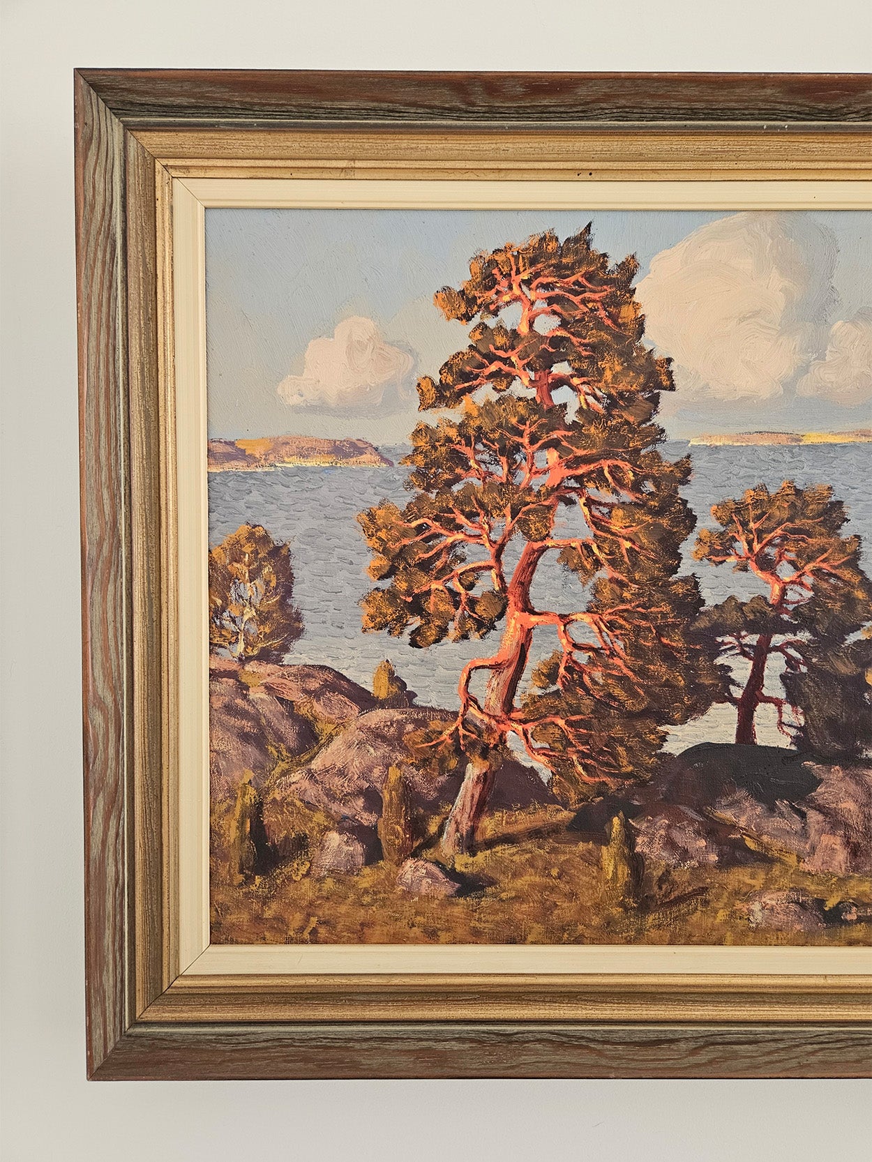 Striking oil on canvas depicting Swedish islands with red trees and blue waters. Presented in original timber frame, showing beautiful, detailed grain.
